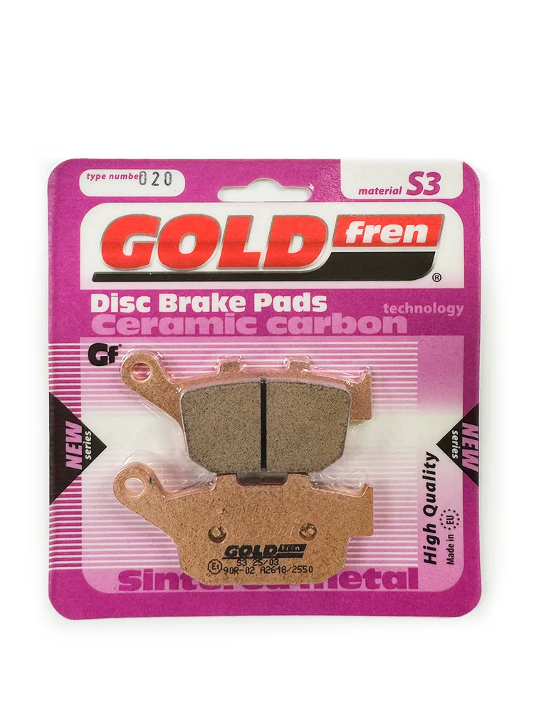 GOLDfren производит только металлокерамические тормозные колодки на мотоциклы и квадроциклы. Cпечённые тормозные колодки для мотоцикла, содержат металлокерамические и керамически-углеродные фрикционные материалы, которые обеспечивают меньше пыли и обеспечивают гораздо более тихое торможение.