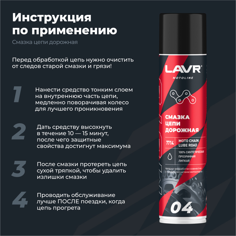 Перед обработкой цепь очистить от следов старой смазки и грязи с помощью Очистителя цепи Ln7701. Тщательно встряхнуть баллон перед использованием.