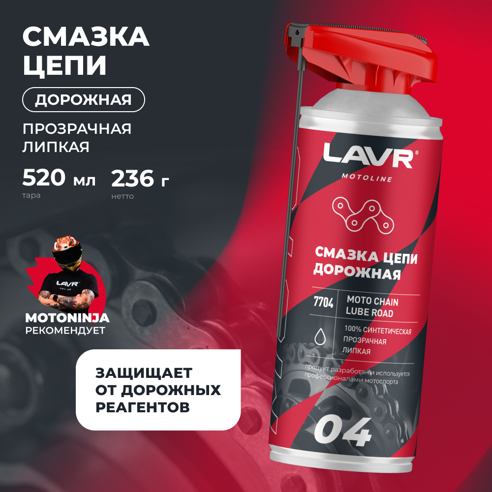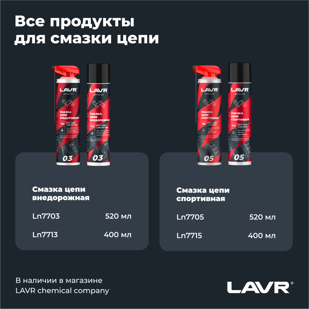 Перед обработкой цепь очистить от следов старой смазки и грязи с помощью Очистителя цепи Ln7701. Тщательно встряхнуть баллон перед использованием.