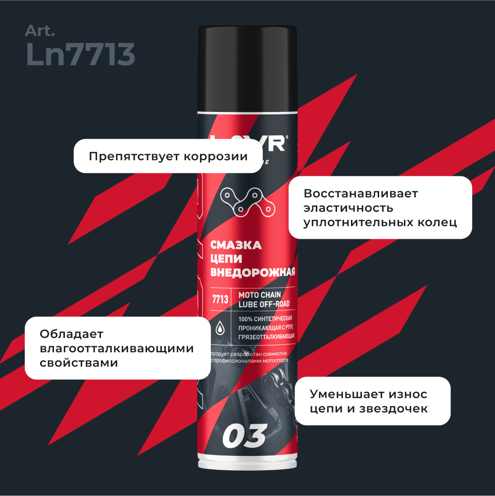 Перед обработкой цепь очистить от следов старой смазки и грязи с помощью Очистителя цепи Ln7701. Тщательно встряхнуть баллон перед использованием.
